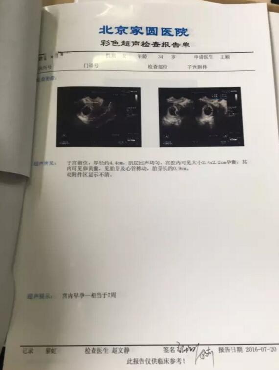 助孕后的第七周,B超检查结果显示 单胎宫内妊娠。