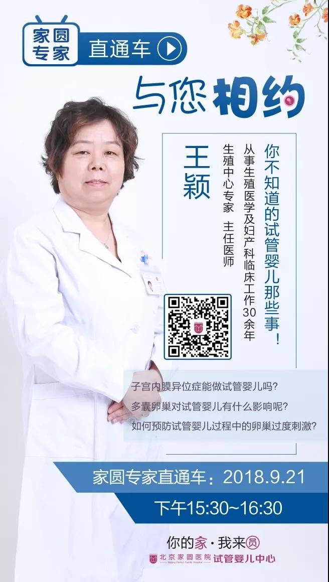 9月21日(本周五)下午15:30~16:30,北京家圆试管婴儿医院生殖中心王颖主任与您相约,为您答疑解惑。
