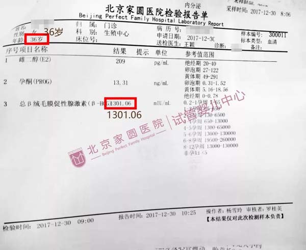 针对宋女士的卵巢储备功能情况,王颖主任制定了适宜的促排卵方案。用药8天后,宋女士获取到4枚卵子,培养成胚胎,而后顺利移植2枚。移植两周后首次验孕,血值检查HCG1301.06,一次试管婴儿即宣告成功。