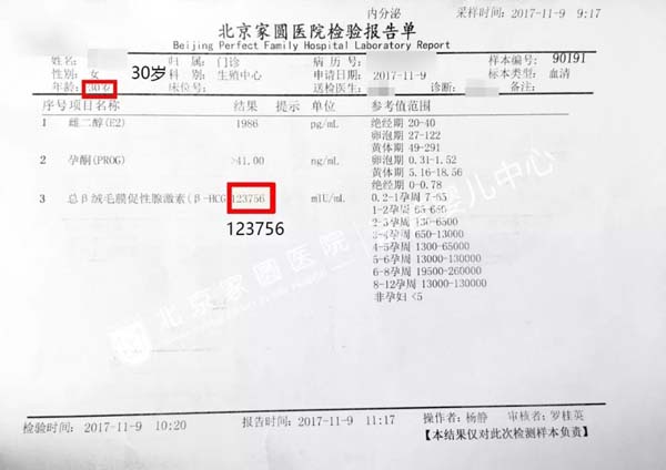 努力前行的人终究不会被辜负,移植后14天查血提示怀孕,18天顺利翻倍(以下hCG报告单为翻倍后的检查结果),35天B超提示宫内单胎,好消息让莉莉喜极而泣。三年求子路,这是她较高兴的一刻。