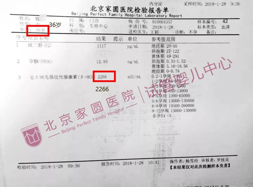 2018年1月28日,魏茜(化名)在丈夫的陪同下,到北京家圆试管婴儿医院进行了胚胎移植后的第一次血检,HCG显示2266,确诊怀孕!