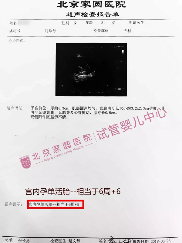 5月28日,郭丽再次回到家圆医院,接受胚胎移植手术,廖希主任为其移植了2枚胚胎。手术非常顺利,术后14天抽血检测,一次助孕成功!当时郭丽夫妇都非常激动,压在心中的大石头也总算落了地。